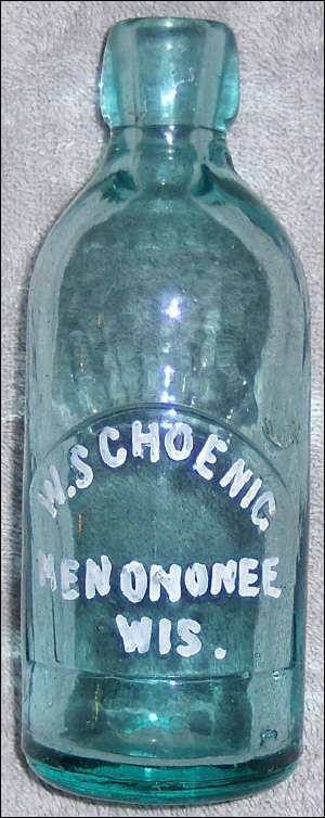 Wow! This very rare (and transitional looking) antique soda bottle features a tombstone (horseshoe shaped) slug plate, an oval blob, and a misspelled city. It comes from the vulture of bottles, Mr. Mark. Thank you. The embossing reads, "W. SCHOENIG MENOMONEE WIS." I'm wondering if this may have been an alternate spelling for the city as this error occurs on other bottles?