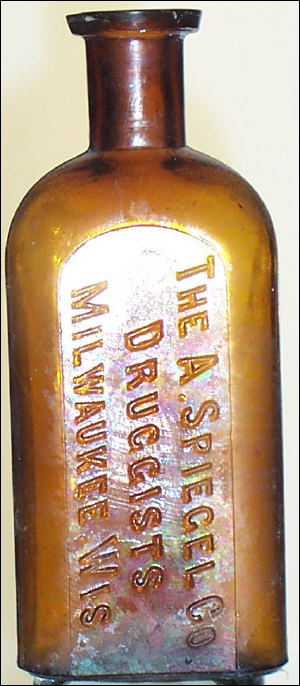 This amber colored medicine is embossed on a slant, "THE A. SPIEGEL CO. DRUGGISTS MILWAUKEE, WIS." The first letter of every word is bigger. The glass company is W. T. & Co. 2 U.S.A. (bottom).