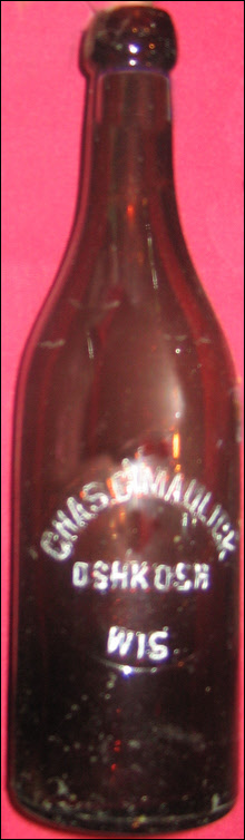 Yet, another blob top beer bottle from Bob! This time it is an amber, "Chas Maullick, Oshkosh, WIS." pint blob top beer bottle. Thanks Bob! Inscription reads, “CHAS G MAULICK OSHKOSH WIS.” Maullick & Kitz (1891- mid 1890s) Frank H. Kitz and Charles G. Maulick were agents and bottlers of Schlitz beer. The office was located at 162 Main St. Oshkosh, WI. (also the location of their saloon). The bottling plant was located at 13 Division St. along the tracks of the Wisconsin Central and C. M. & St. P. Railroads. They devoted all of their bottling operations to Jos. Schlitz beer (they could handle four carloads a week).