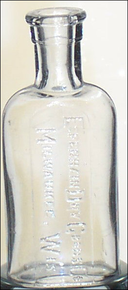 This cute little medicine is under 2 & 5/8 inches tall. In an old fashioned font, the bottle reads, "ESPENHAIN DRY GOODS CO MILWAUKEE, WIS." The first letter of every word is larger. Glass company is CLGCO 2 (bottom).