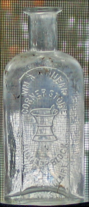 Here is a tremendous "Wm. A Kinnear, Corner Store, In, Pioneer Block, West Eau Claire, WIS. drugstore bottle. The first two lines, "Wm. A. Kineer, Corner Store" arch downward, and the words "Pioneer Block, West Eau Claire" arch upward. In between is a embossed mortar and pestle. This bottle comes from the first Pioneer Block building which was built in 1876 and burned in 1882-1884. It probably dates from the late 1870's. Note that it is embossed "West Eau Claire" instead of "Eau Claire". A few other Eau Claire drugstores have this embossing. The glass maker is W.T. & Co.