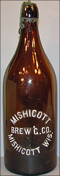Inscription on this antique brown blob top bottle reads, “MISHICOTT BREW’G CO. MISHICOTT WIS.” It’s a nice picnic bottle, about 14 inches high, designed for beer brewed and bottled by the Mishicot Brewing Company of Mishicot, Wisconsin (the correct spelling is with one "T"). The bottom is embossed "W F & S MIL" (William Franzen and Son, Milwaukee).