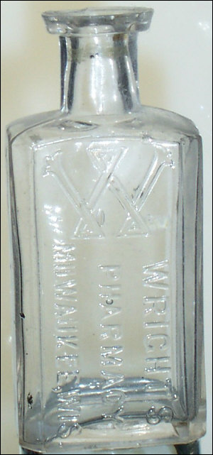 This antique medicine bottle has a fancy outline of a "W" on it. The other embossing reads, "WRIGHT'S PHARMACY MILWAUKEE, WIS." The bottom is faded but it has at least a W. and an S. The size is about 4 & 3/8 tall, 1 & 7/8 wide, and 1 & 1/4 thick. The corners are angled out of square.